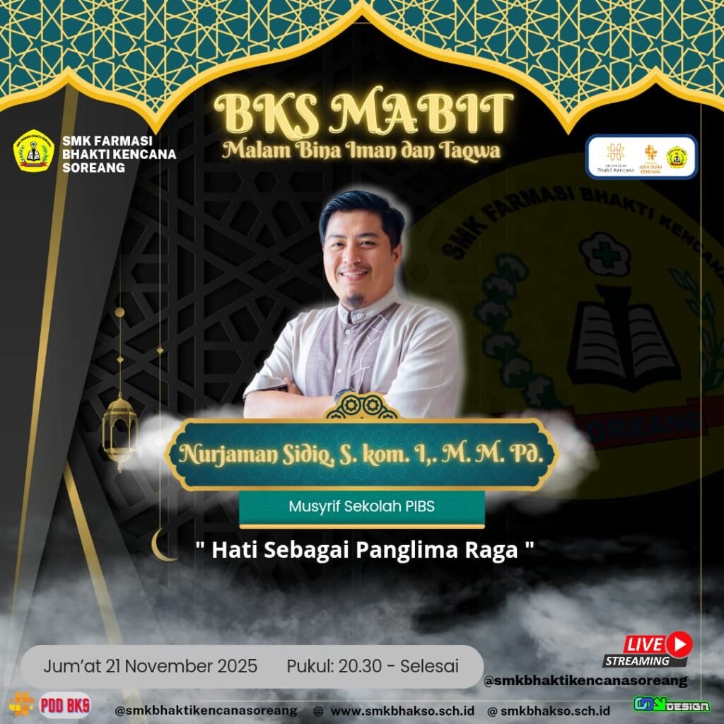 Soreang, 21 November 2025 — SMK Farmasi Bhakti Kencana Soreang kembali menyelenggarakan kegiatan BKS MABIT (Malam Bina Iman dan Taqwa) sebagai salah satu program pembinaan karakter religius bagi peserta didik. Acara ini digelar pada Jumat malam, 21 November 2025, mulai pukul 20.30 WIB hingga selesai. Pada MABIT tahun ini, sekolah menghadirkan pemateri Nurjaman Sidiq, S.Kom., […]